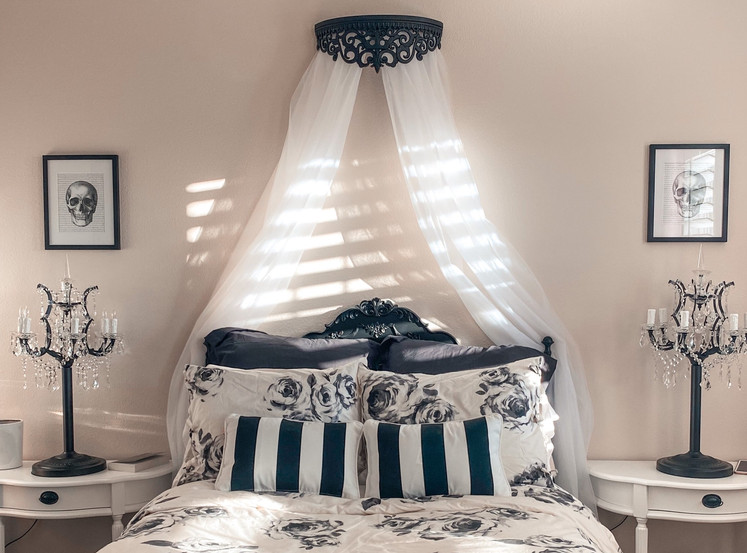 It's far more feminine than I usually go for, but it was truly the only thing that I could find that I felt would work with this complicated theme. I eventually balanced out the femininity of it by creating a juxtaposition between the roses and some framed artwork on either side of the bed, which you'll see at the end. I decorated it with the matching pillows and some patterned shams from Amazon, and it came together nicely. Check out the photos at the bottom to see the final result.